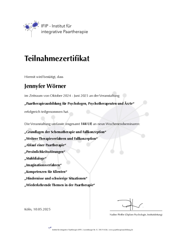 Mein Name ist Jennyfer Wörner. Als Paartherapeutin und Coach begleite ich Menschen in herausfordernden Beziehungssituationen – empathisch, lösungsorientiert und ohne leere Versprechen.